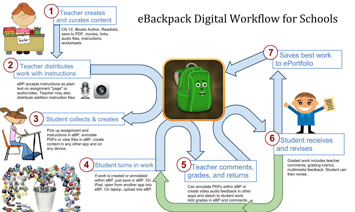 I adapted this diagram created by e-Backpack and to use with Google Drive, Blackboard (our LMS) as well as other cloud-based applications to drive our workflow with our Junior students. We found that this diagram helped us envision how the process of learning might look in a tablet environment and invited changes, suggestions and clarifications. This workflow discussion led to further discussion and training ideas on collaborating using Docs, Forms, Spreadsheets or Presentations. In addition, determining the most effective pedagogy and the application from Google (Lucidchart (graphic organizer) (although I prefer popplet.com), Kaizena (Voice commenting), Floor Planner and Powtoon (Animated presentation tool) will be areas for future sessions, discussions and sharing.
