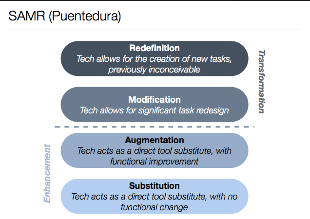 The SAMR model was designed by Dr. Ruben Puentedura and allows teachers to evaluate how technology enhances or transforms the learning experience. Is it substitution of a practice already occurring WITHOUT technology?  Does it augment the practice with additional features? Does it modify the task in different and exciting ways? Or does this technology completely redefine the task?